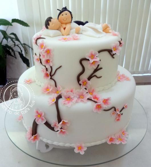 O bolo de Bodas de Papel com pasta americana é lindo e permite criar vários detalhes delicados, como esse que tem flores e o casal em um momento romântico em cima.