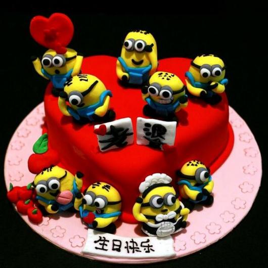 Olhe uma dica para bolo romântico com o tema Minions! A pasta americana também foi a aposta para a cobertura: