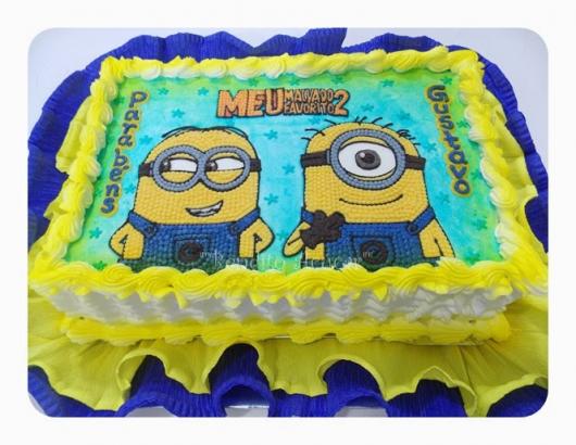 O bolo abaixo foi feito para aniversário de duas pessoas! De um lado, a decoração com papel de arroz dos Minions, de outro, da Frozen!