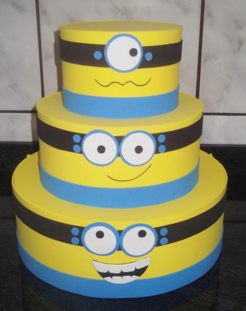 O bolo fake é uma forma interessante de fazer a decoração de uma festa dos Minions, com materiais econômicos e colaborando para deixar o visual temático completo.