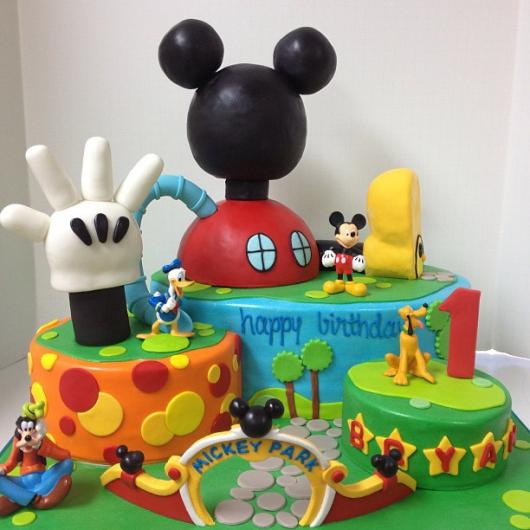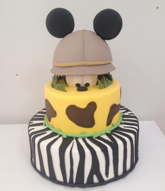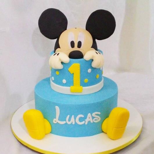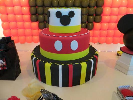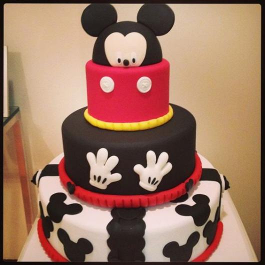 Já mostramos algumas fotos bacanas de bolos falsos com o tema Mickey que parecem reais. É importante saber que essa tendência está mais em alta do que nunca. Geralmente é o bolo cenográfico que fica exposto na festa para que os convidados e aniversariantes tirem fotos. Ele pode ser fiel ao original ou, em perspectivas modernas, o bolo comestível é entregue em potes ou pratinhos, acabando com o hábito de cortá-lo após o parabéns.