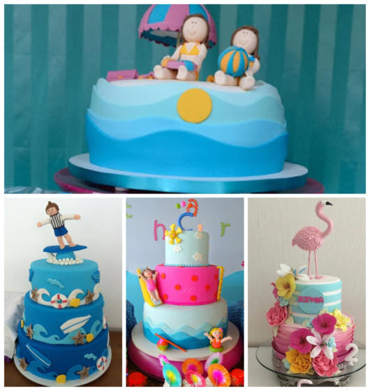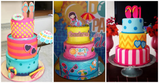 Para quem é fã de um bom bolo alto, pode ficar tranquilo porque também temos modelos desse tipo. Feitos em pasta americana, uma vez que eles ficam mais secos e firmes, esses tipos de bolo pool party ficam lindos e chamam bastante atenção.