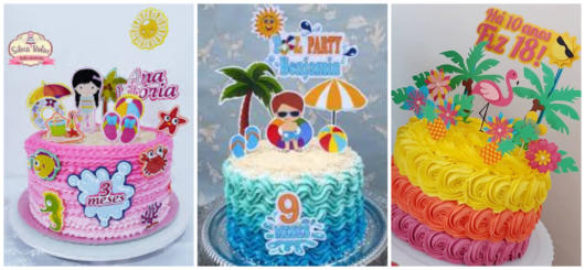 Desenhos como sol, doces, chinelos, e animais do mar podem ser usados para enfeitar o bolo.