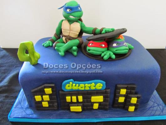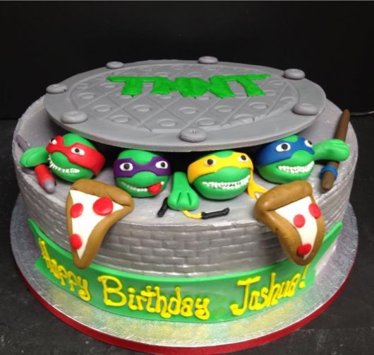 Um bolo Tartarugas Ninja de pasta americana é o que confere o resultado mais interessante visualmente, já que pode ser modelado da forma que o confeiteiro quiser, produzindo formas diversas.