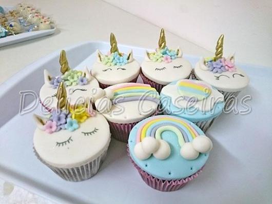 Os tipos de decorações mais comuns tanto para o cupcake  de unicórnio quanto para os bolos de unicórinio são os toppers, pasta americana, chantilly, chifres e arco-íris. Para deixa a mesa bem completa e bonita é legal usar algumas unidades de cupcake decoradas de cada forma diferente.