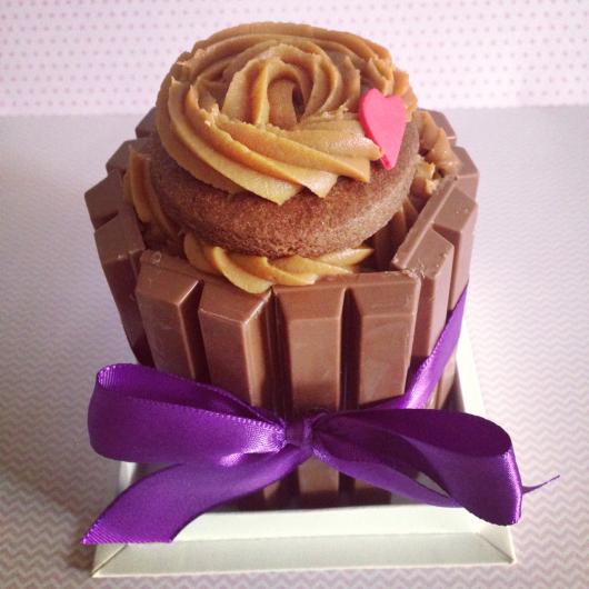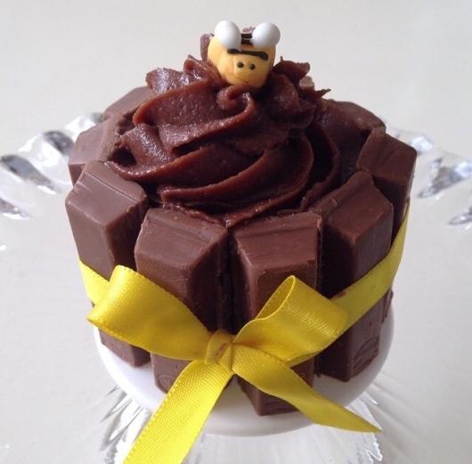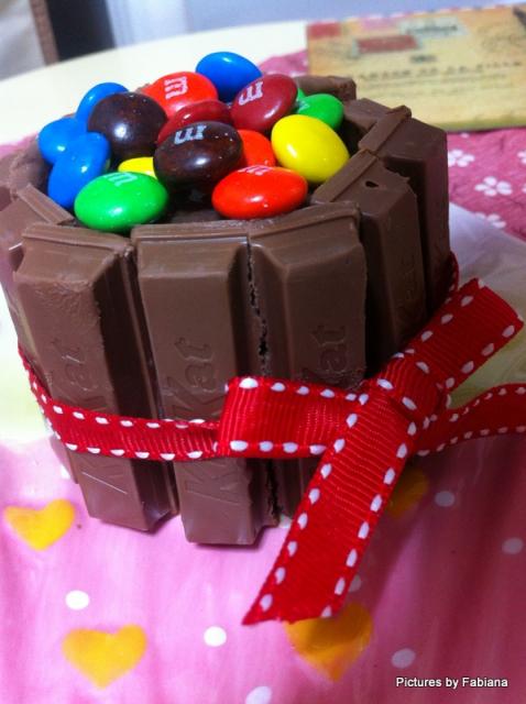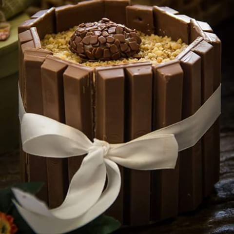O Kit Kat e o Kinder Bueno são muito usados hoje em dia para finalizar bolos de todos os tamanhos e sabores. O mini bolo de chocolate não poderia ficar de fora dessa tendência deliciosa. As barrinhas dão um visual mais divertido e também mais organizado – você pode inovar na decoração mais facilmente, com laços e confeitos.
