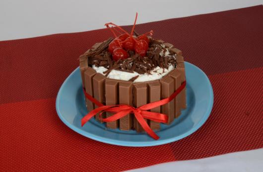 O mini bolo de chocolate com Kit Kat em volta pode ser feito para qualquer ocasião, desde um aniversário até o Natal