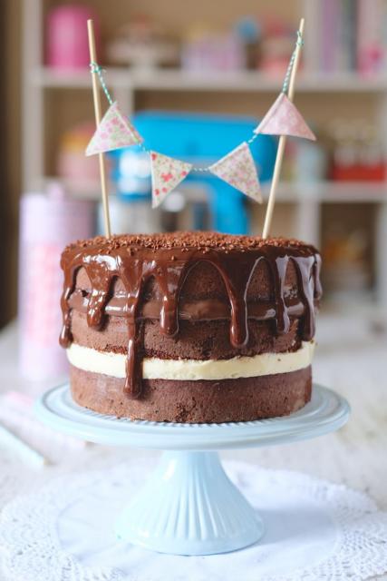 A massa de chocolate com o recheio branco forma um visual incrível. A cobertura caindo pelas beiradas também dá um charme a mais.