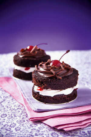 Combine chantilly na cobertura com raspas de chocolate ao leite e cerejas. Bem clássico.
