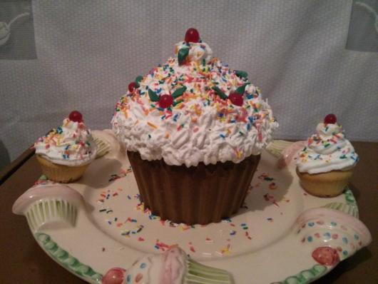 Veja uma ideia de mini bolo em formato de cupcake! O chantilly deixou o visual lindo e combinou bastante com o granulado colorido.