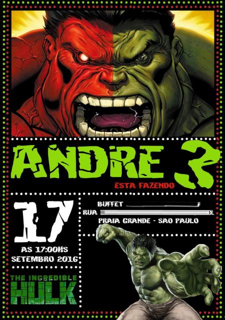 Para quem prefere algo bem diferente, descolado e criativo, a ideia abaixo é uma ótima indicação. O Hulk Vermelho também é muito popular entre os jovens e esse convite une as duas versões do herói.