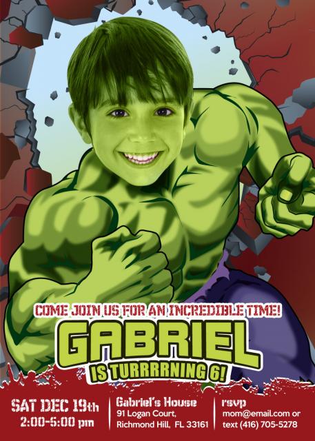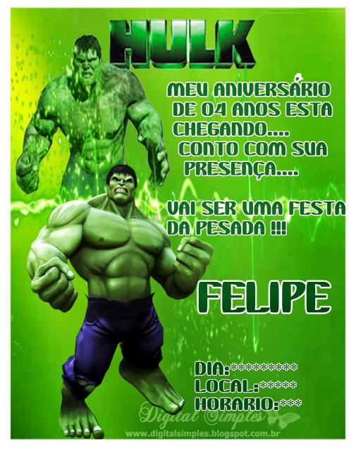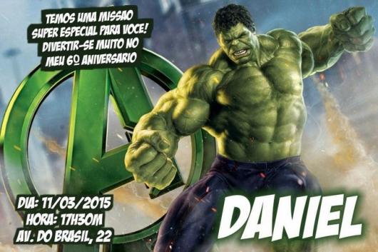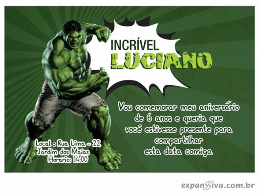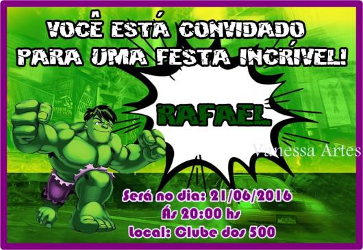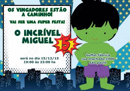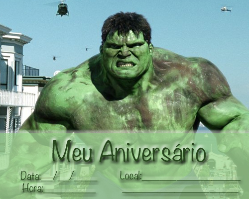 Esse é o padrão geral de todo convite: uma foto/referência ao Hulk, as informações da festa e, se quiser, uma foto do aniversariante. Pronto, assim você tem o melhor modelo para distribuir aos convidados!