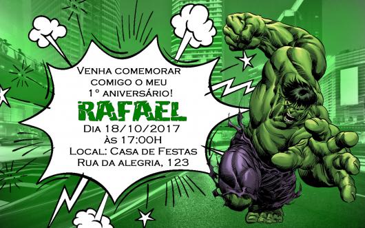 Há várias disposições e linhas possíveis para seguir quando se trata do convite do Hulk. Há muitos padrões bacanas disponíveis na internet que você pode utilizar na festa, seja no formato físico ou digital. Em diversos moldes é possível editar para deixar de acordo com as informações de seu evento, para isso você deve contar com um profissional ou com uma gráfica especializada.