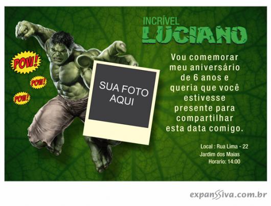 Esse é o padrão geral de todo convite: uma foto/referência ao Hulk, as informações da festa e, se quiser, uma foto do aniversariante. Pronto, assim você tem o melhor modelo para distribuir aos convidados!