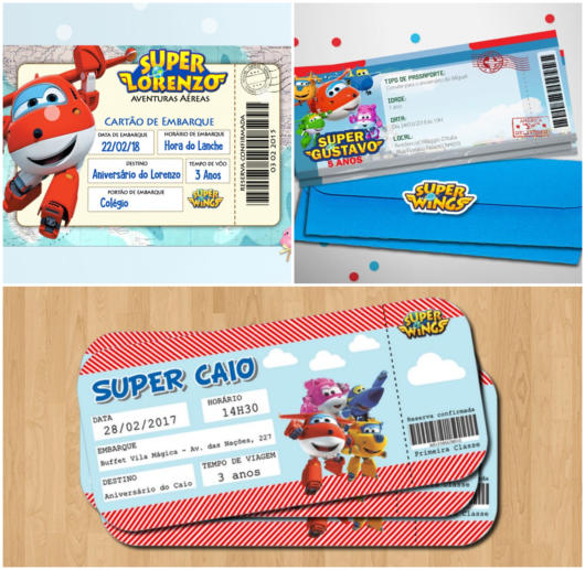 Tendo em vista que o desenho Super Wings é baseado em aviões, um tipo super irreverente desse convite é quando ele tem formato de cartões de embarque ou passagens de avião, um tipo de ideia que pode ser levada até mesmo para a hora da decoração do bolo. O bacana desse modelo é que ele costuma agradar não apenas os convidados adultos, como os infantis também.