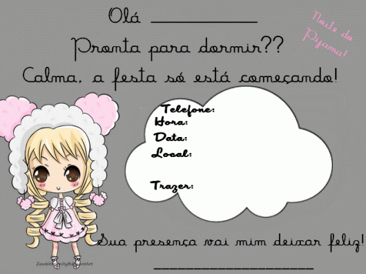No entanto, como se trata de convites para festa do pijama, pode ser interessante colocar observações sobre como será a festa. Fale, por exemplo, que haverá brincadeiras, sessão cinema, dança, desfile de moda, guerra de travesseiros, enfim, dê uma prévia do que a criança encontrará no dia.