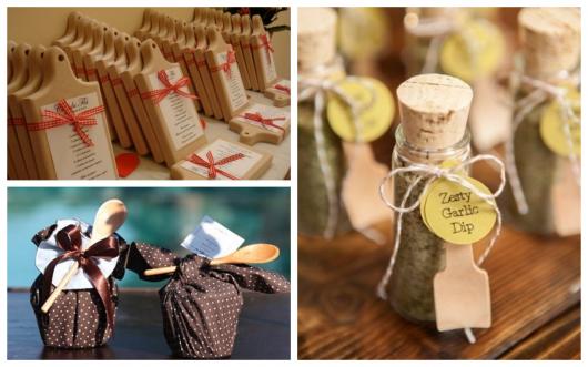 Há muitas opções de lembrancinhas que combinam com um chá de panela rústico, desde as colheres de pau típicas aos temperos, doces e geleias. Você pode escolher vidrinhos e e garrafinhas de vidro, decoradas com tecido e fitas para dar um charme a mais.