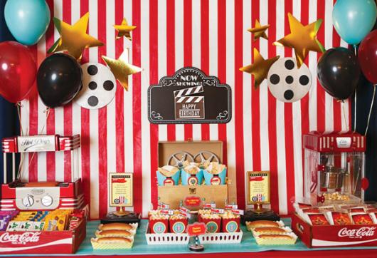 Em uma festa com o tema cinema é bacana servir alimentos que geralmente comemos quando vamos assistir filme: pipoca, chocolate, refrigerante e todas as guloseimas que amamos.