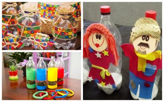 Com as garrafas PET de todos os tamanhos você pode fazer bonecos caipiras ou da cultura nordestina, como o Lampião e a Maria Bonita; porta alimentos típicos; objetos decorativos, como balões, barraquinhas, fogueiras, flores, animais… entre muitos outros objetivos.