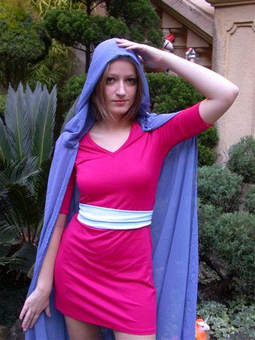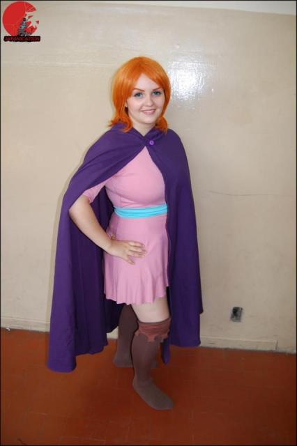 O capaz pode ser feito com qualquer tecido sintético e uma bela capa. As cores são fortes: rosa e roxa. Precisam ser mantidas porque são características da personagem. O vestido é curto, na altura do joelho.