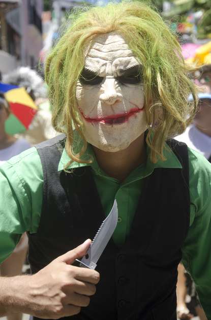 Para imitar o Coringa, basta fazer uma make parecida – peça ajuda para alguém – e pintar uma camiseta branca. Se você for mais ousado vale colorir o cabelo também.