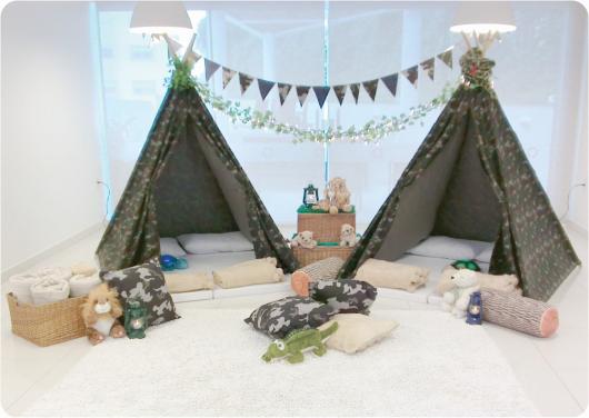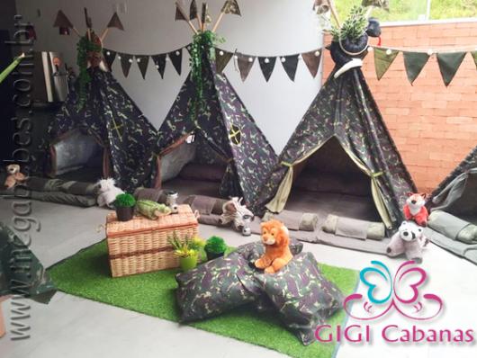 - Kids Cabanas Festa do Pijama – Essa é outra loja somente de cabanas para festa do pijama para locação. Nesse anúncio especificamente, trata-se de modelos em tecido camuflado, o que dá um charme a mais para a noite de comemoração. O preço, na promoção, está R$150 por cabana.