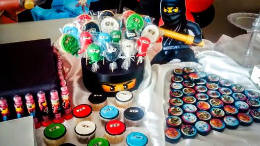 Os doces personalizados são a atração da festa. Os cupcakes decorados com pasta americana com o rosto dos ninjas são uma ótima sacada e bem fáceis de fazer em casa, pois é só abrir a pasta e cortar usando um cortador redondo. É possível usar a pasta de leite em pó para ter esse mesmo efeito.