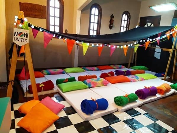 Os colchonetes com cobertas e travesseiros coloridos fazem parte da festa
