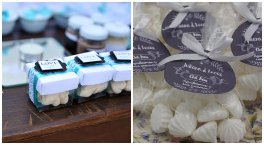 Uma ótima ideia é colocar os suspiros em uma mesa decorada, seja com desenhos ou imagens do casal.