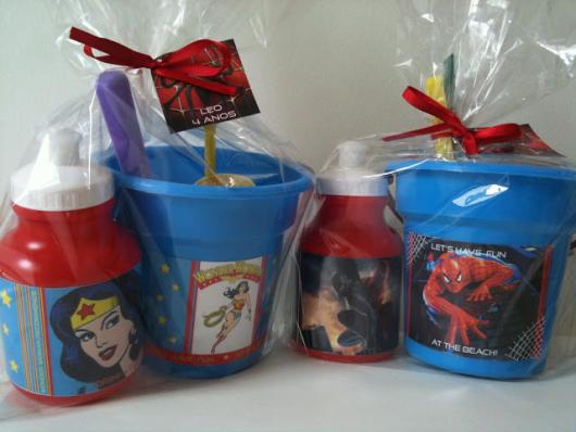 Brinquedos para praia estão na lista top 10 de lembrancinha. O kit no geral é com baldinho, pá e formas para areia. O bacana é que mesmo sendo um brinquedo específico para usar em praia vale usar omo lembrancinha super-heróis as cidades. As crianças adoram e elas são seu público alvo.