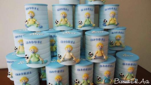 As latas servem como base para você colar desenhos cortados em EVA, em cartolina ou em feltro, além dos típicos adesivos que são impressos com o tema escolhido. Você também pode colocar nelas bonequinhos de biscuit para deixar a lembrancinha ainda mais original!