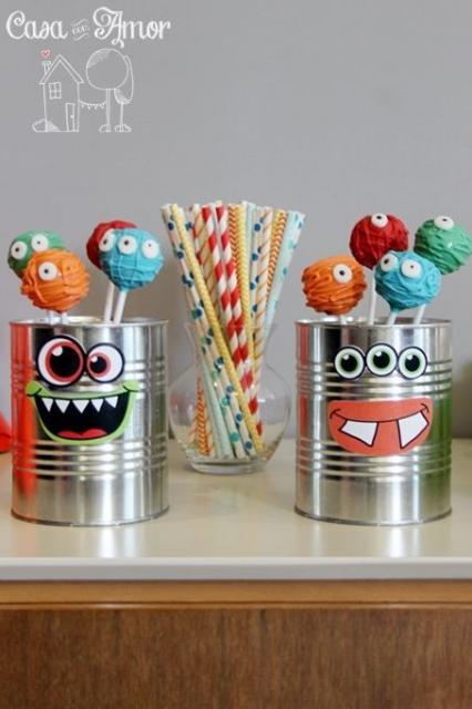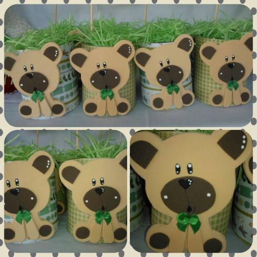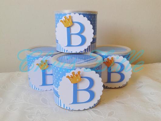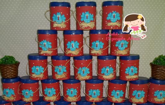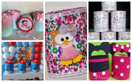 As latas servem como base para você colar desenhos cortados em EVA, em cartolina ou em feltro, além dos típicos adesivos que são impressos com o tema escolhido. Você também pode colocar nelas bonequinhos de biscuit para deixar a lembrancinha ainda mais original!