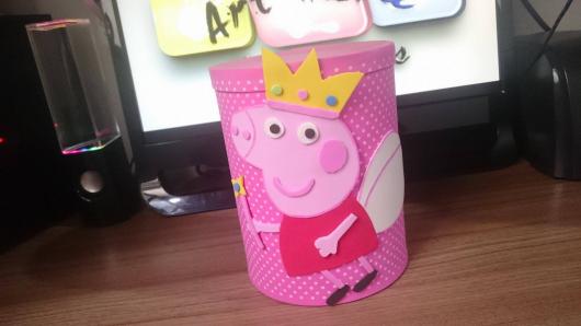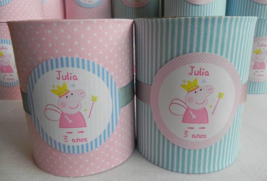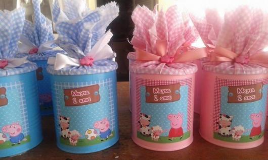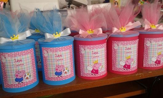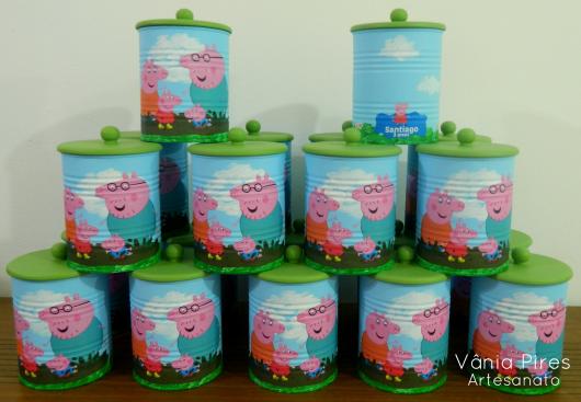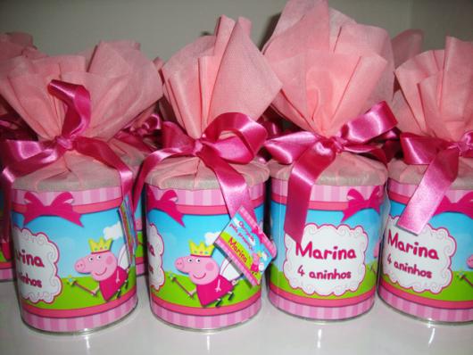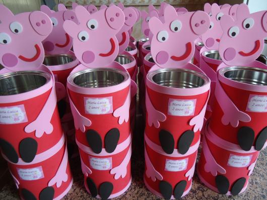 Invista um tempinho para produzir lembrancinhas com lata de leite criativas relacionadas a Peppa. Você pode usar materiais como EVA para criar a carinha e o corpinho da porquinha e TNT para cobrir a lata e fazer um laço bem bonito.
