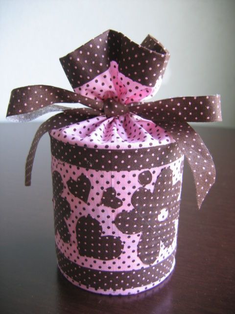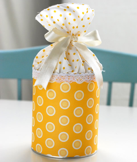 3. Caso ainda ficar alguma bolhinha de ar, fure com estilete de leve para retirar o ar. Cole com cola quente uma fitinha nas extremidades da lata para melhorar o acabamento. E prontinho!