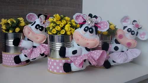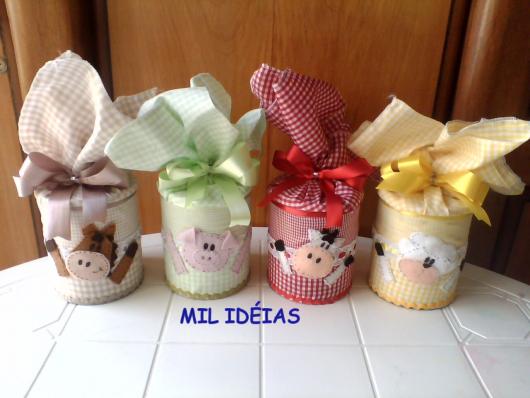 Esta é uma ideia muito prática, pois há na internet diversos moldes de animais da fazenda para imprimir e copiar em EVA, cartolina e outros materiais. Você pode escolher pelo menos três espécies de bichos para fazer e compor as latas, que podem ser de leite ninho, Aptamil ou de leite condensado.