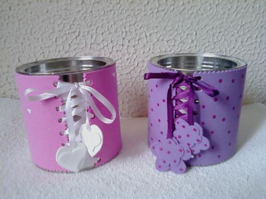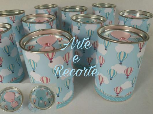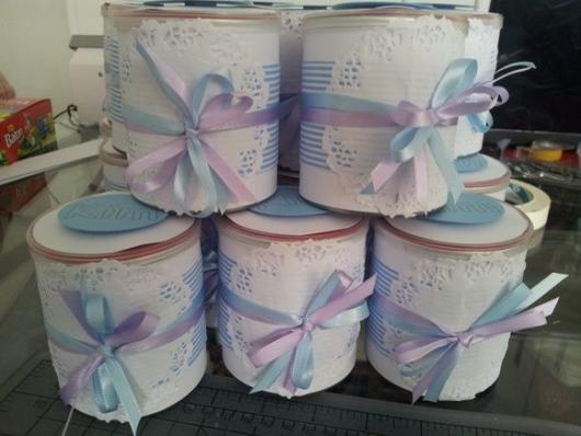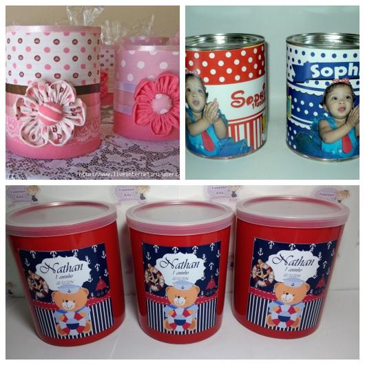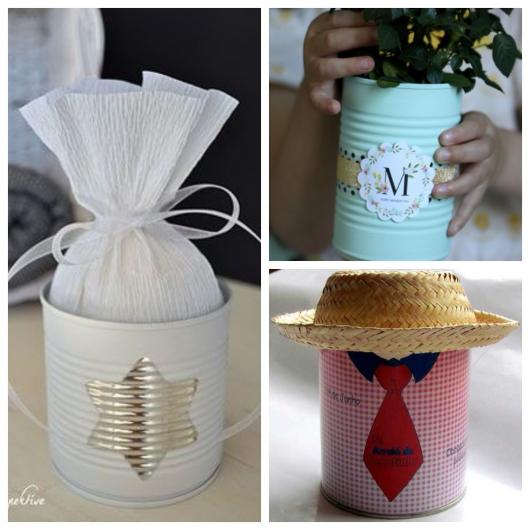 O bom de utilizar as latas para presentear seus convidados, é que, além de ficarem bem bonitas e personalizadas, elas também oferecem alguma utilidade para eles. Elas podem ser finalizadas com a tampa, podendo servir como porta-trecos, cofrinhos, pote de doces, etc; ou sem a tampa, podendo funcionar como porta-lápis, entre outras funcionalidades.