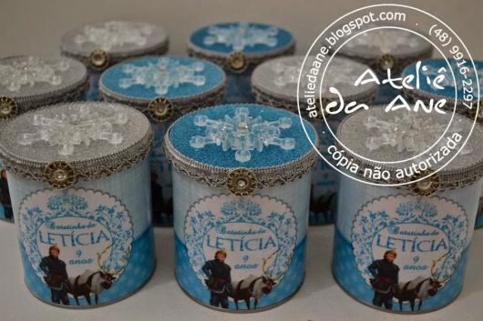 Para completar a decoração de sua festa da Frozen, aposte em lembrancinhas com lata de leite decoradas, seguindo as cores que você utilizar para o ambiente e para as mesas. O azul é a cor mais usada neste caso, mas você pode inovar apostando no rosa e no roxo.
