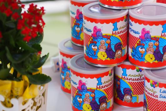 A personagem principal é a Galinha Pintadinha, mas na decoração da lata você também pode colocar toda a turma: o pintinho amarelinho, a borboletinha, o galo carijó e a baratinha. Assim a lembrancinha fica completa e agrada seus convidados pequeninos ainda mais!