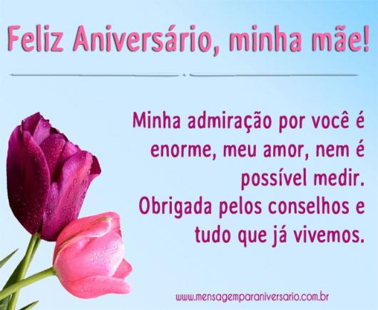 Feliz aniversário minha rainha… minha mãe! Hoje é um dia especial, o dia do seu aniversário e eu peço a Deus para te abençoar, te dar muita paz, alegria e saúde com abundância. Um grande beijo e um forte abraço para você. Te amo!