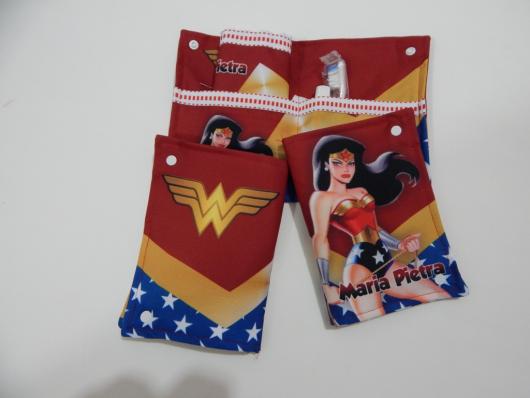 A bolsinha de feltro é uma mini nécessaire com toalhinha, pasta de dente e escova; e traz a decoração em feltro ao estilo da festa Mulher Maravilha.